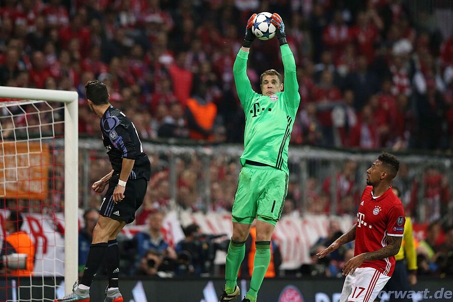 Manuel Neuer / Bayern: Die erste Torchance des Spiels hatten die Gäste aus Madrid: Benzema kam nach einer Flanke zum Kopfball und traf per Aufsetzer die Unterkante der Latte. Bei genauerem Hinsehen bemerkte man, dass Manuel Neuer den Ball noch minimal mit seinen Fingerspitzen tuschierte und so den frühen Gegentreffer mit einer ersten Weltklasse-Parade verhinderte. In der ersten Halbzeit war es ein absolut offener Schlagabtausch, beide Mannschaften erspielten sich nennenswerte Chancen. Kurz vor der Pause scheiterte der mehrfache Weltfussballer Cristiano Ronaldo am glänzend reagierenden Manuel Neuer, der nach seiner kurzen Verletzungspause hellwach und fokusiert in diese Partie ging.