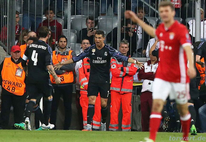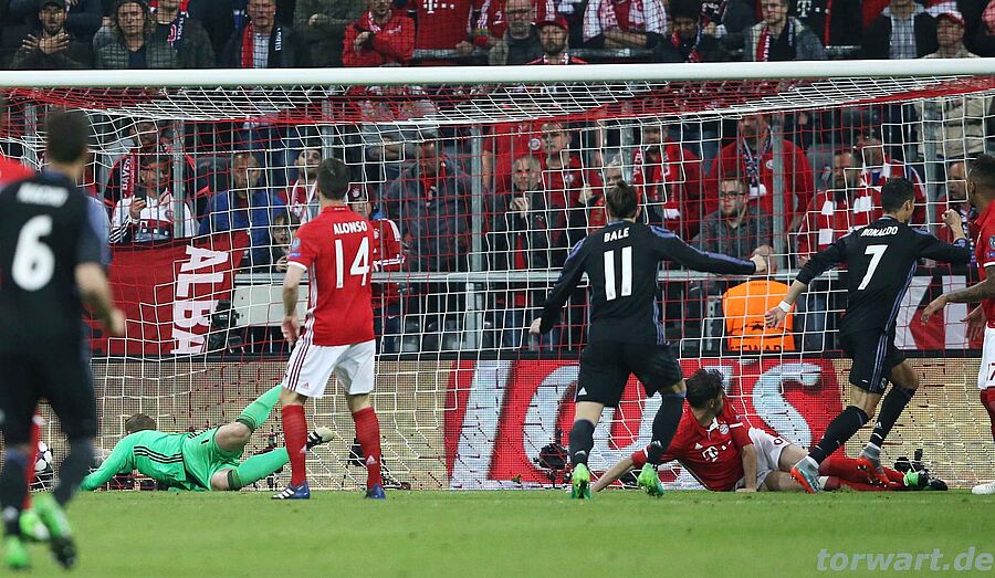 Kurz nach der Halbzeitpause schlug Real in Person von Cristiano Ronaldo eiskalt zum 1:1 zu: Der Portugiese nahm eine Carvajal-Flanke im Zentrum direkt ab und traf flach ins Eck. Manuel Neuer war beim bitteren ersten Auswärtstreffer der Königlichen absolut chancenlos. Bayern kam nun unter Dauerbeschuss: Wenig später hatte nämlich Bale gar die Führung auf dem Kopf, scheiterte aber aus sechs Metern am blitzschnell reagierenden Neuer. Neuer´s Arme schnellten in die Höhe, sodass der deutsche Nationalkeeper den wuchtigen Kopfball noch über die Querlatte lenken konnte. Im weiteren Verlauf der zweiten Halbzeit musste Manuel Neuer immer öfters seine absolute Spitzenklasse unter Beweis stellen. Nachdem die Bayern sich nach der gelb-roten Karte für Martinez tief in die eigene Hälfte drängen ließen, erarbeitete sich Madrid eine Chance nach der anderen.