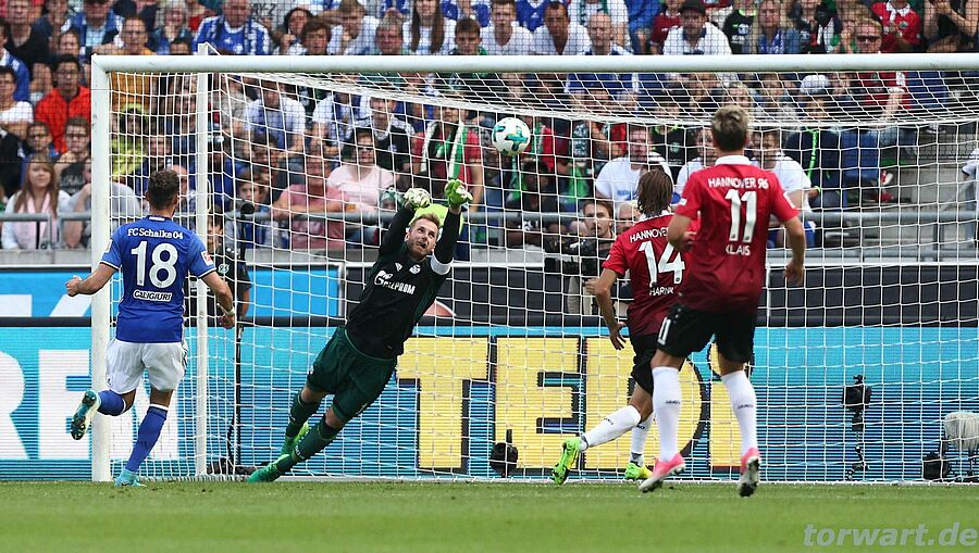 Ralf Fährmann / FC Schalke 04: Vor dem Tor von Fährmann wurde es erst nach nach gut einer viertel Stunde gefährlich: Nach einem Schwegler-Freistoß prüfte Sané Fährmann per Kopf. Der Schalker Schlussmann reagierte klasse, wie auch Sekunden später gegen Klaus. Zwar erspielte sich 96 im ersten Durchgang einen Vorteil von 9:2-Torschüssen, aber wirklich geprüft wurde Fährmann nicht. Der Schalker Schlussmann strahlte als Kapitän viel Ruhe und Souveränität aus. In der zweiten Halbzeit passierte dann lange nichts.