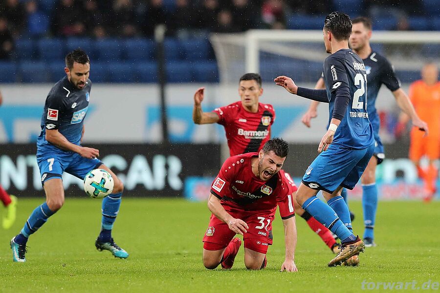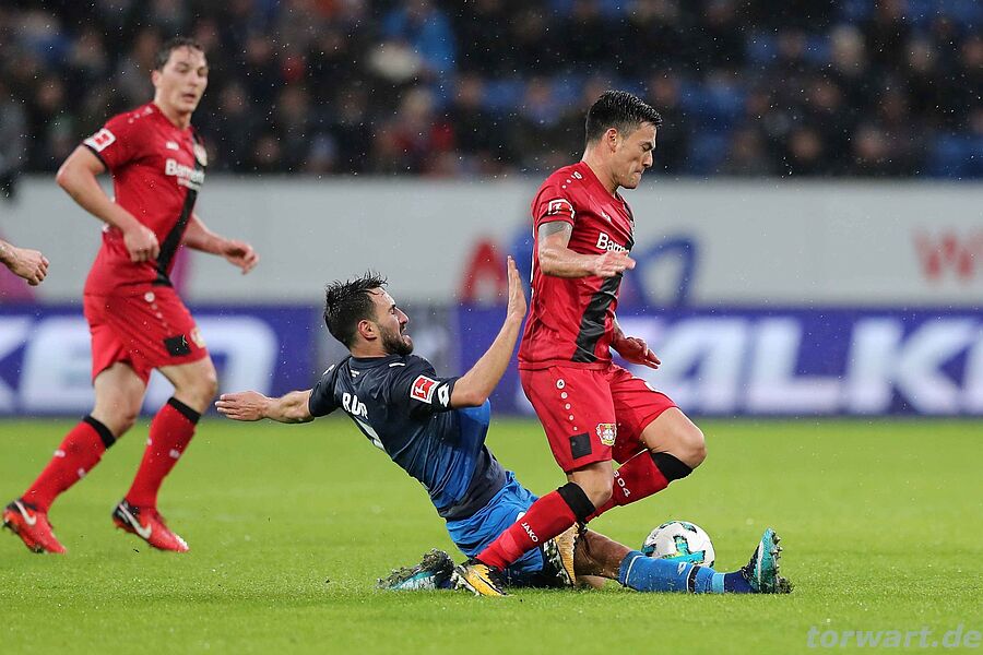 Oliver Baumann / Hoffenheim: Lange kam Bayer gegen kompakt spielende Hoffenheimer nicht durch. Als es in der 43. Minute zum ersten Mal so richtig gefährlich wurde, fiel gleich der Treffer: Nach schnell vorgetragenem Angriff über rechts fand Brandt in der Mitte Bailey, der mit dem Rücken zum Tor einen sehenswerten Hackentreffer ins rechte Eck erzielte. Baumann war bei diesem fantastischen Abschluss ohne Chance. Bayer blieb dann auch in der 52. Minute effektiv: Nach Flanke von Bailey legte Lars Bender rechts am Strafraumrand in die Mitte zu Baumgartlinger, dessen Direktabnahme im linken Toreck einschlug.