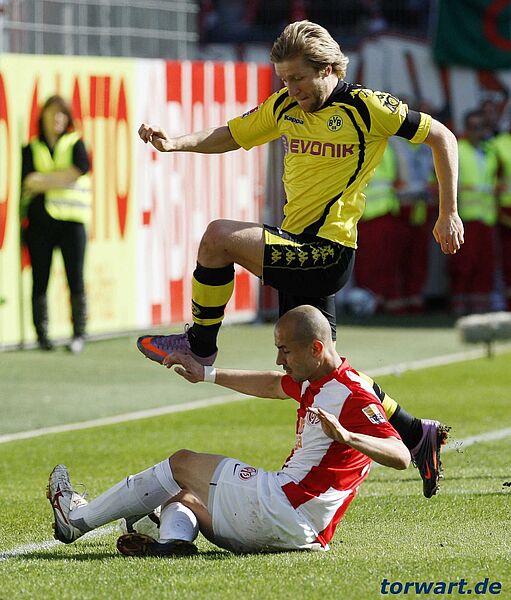 Roman Weidenfeller / Dortmund:30 Minuten waren am Mainzer Bruchweg gespielt, als Roman Weidenfeller den Ball aus seinem Tornetz pulen musste. Szalai hatte sich gegen vier Borussen freigemacht und aus 15 Meter eine Lücke zwischen Weidenfeller und Torpfosten erwischt ¬– ein herrlicher Treffer. Und fast wäre es noch dicker gekommen für die Gäste, drei Minuten nach dem Führungstor hämmerte Bancé einen Freistoß auf den Kasten den BVB-Keepers, doch der konnte fantastisch parieren. Was nicht viel half: Dortmund verlor die Partie durch eben dieses eine Tor.