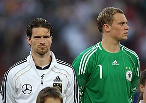 Nummer eins: Manuel Neuer(24 Jahre/3 Länderspiele) ist die deutsche Nummer eins. Kurz vor seinem ersten Bundesligaspiel bestritt er am 15. August 2006 seine erste Partie für die U-21-Nationalmannschaft des DFB. Neuer spielte die zweite Halbzeit gegen die Niederlande und zeigte eine solide Leistung. Anfang 2006 wurde er aufgrund seiner Leistungen bei der Junioren-EM 2005 zum Sportler des Jahres von Gelsenkirchen gewählt.Ende August 2007 lud ihn der DFB erstmals – als vierten Torhüter neben Jens Lehmann, Timo Hildebrand und Robert Enke – zum Fitnesstest der Nationalmannschaft ein. Am 19. Mai 2009 wurde Neuer erstmals von Bundestrainer Joachim Löw für die anstehende Asien-Reise der A-Nationalmannschaft des DFB nominiert. Am 2. Juni 2009 kam er im Länderspiel gegen die Vereinigten Arabischen Emirate (Endstand 2:7 für Deutschland) zum ersten Mal zum Einsatz.Sein größter internationaler Erfolg war der Gewinn der U21-Europameisterschaft 2009 in Schweden unter Bundestrainer Horst Hrubesch, an dem Neuer als sicherer Rückhalt der deutschen Mannschaft maßgeblich beteiligt war.Am 6. Mai 2010 wurde er von Bundestrainer Joachim Löw in den erweiterten Kader für die Weltmeisterschaft 2010 berufen.Am 28. Mai 2010 wurde er als Nr.1 der Nationalmannschaft für die Weltmeisterschaft 2010 benannt.