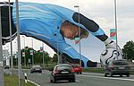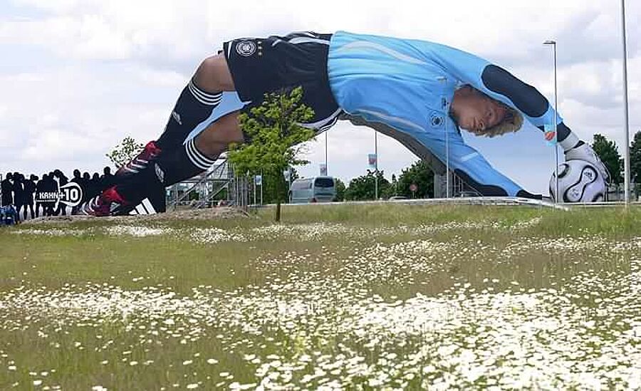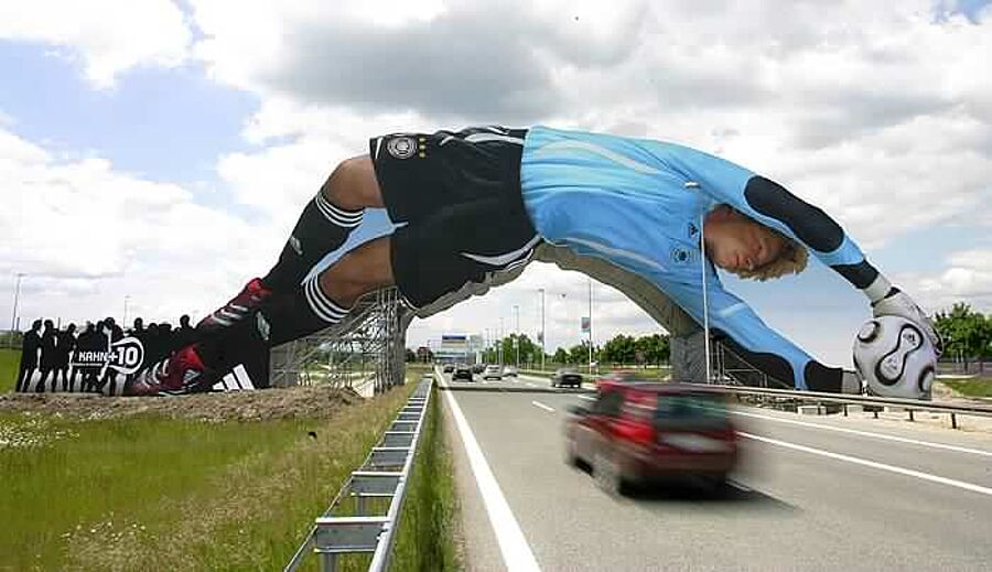 Ein gigantischer Oliver Kahn begrüßt seit der vergangenen Woche die Autofahrer und die Fussballfans in München, wenn sie sich am Münchner Flughafen aufhalten. Das Abbild Oliver Kahns über die Zufahrtsstrasse zum Flughafen nimmt gigantische Ausmasse an. 65 Meter breit und 18 Meter hoch ist die von adidas bereitgestellte Werbefläche. Oliver Kahn wird sowohl von der Vorderseite als auch von der Rückseite gezeigt. Er trägt dabei das aktuelle DFB-Torwarttrikot und hechtet nach dem Teamgeistball.