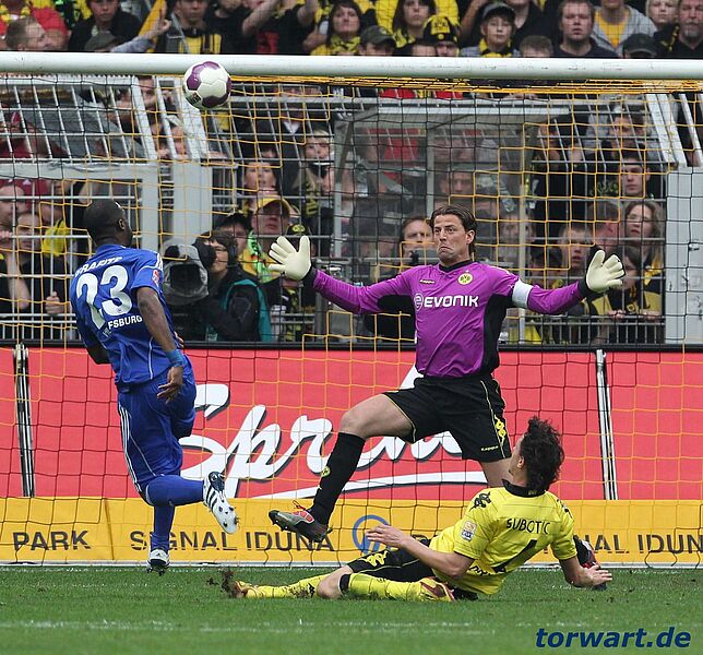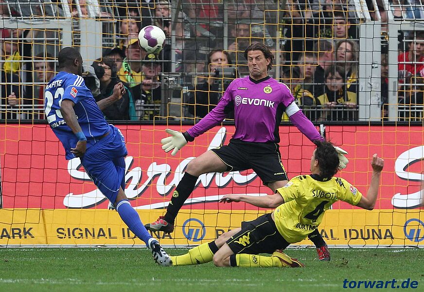 Roman Weidenfeller / Dortmund: So wird kein Torhüter gerne überwunden, und schon gar nicht Roman Weidenfeller. Im vorletzten Saisonspiel musste sich der BVB-Mann noch einmal böse düpieren lassen – und war dabei sogar chancenlos. Nach 67 Minuten war der Ball vor den Kasten von Weidenfeller gerutscht, nachdem Subotic vorbeigegrätscht war. Edin Dzeko, Wolfsburgs überragender Mann, stand mit dem Rücken zu Weidenfeller und tat das einzig richtige: Mit der Hacke spitzelte er den Ball durch die Beine des Keepers. Das können nicht viele, aber eben Dzeko. Für den BVB war dieser Kunstschuss noch auf anderen Ebene schmerzhaft: Die Champions League hat die junge Mannschaft von Jürgen Klopp verpasst. Da half auch der späte Ausgleich von Nachwuchsmann Marco Stiebermann nicht viel weiter.