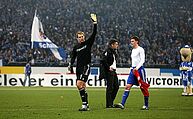 Auf der Gegenseite hatte Faryd Mondragon mehr mit den Schalker Fans zu schaffen, als mit den schlappen Angreifern der Gäste. Eine ganze Handvoll Feuerzeuge sammelte der Keeper später ein, sie waren gefährlich nahe neben dem Keeper auf den Rasen geflogen. Wurfgeschosse sind und bleiben heimtückische Attacken, hätte ein einziges Feuerzeug den Kolumbianer unglücklich am Hinterkopf getroffen, Mondragon hätte wohl mit einer Platzwunde ausgewechselt werden müssen.