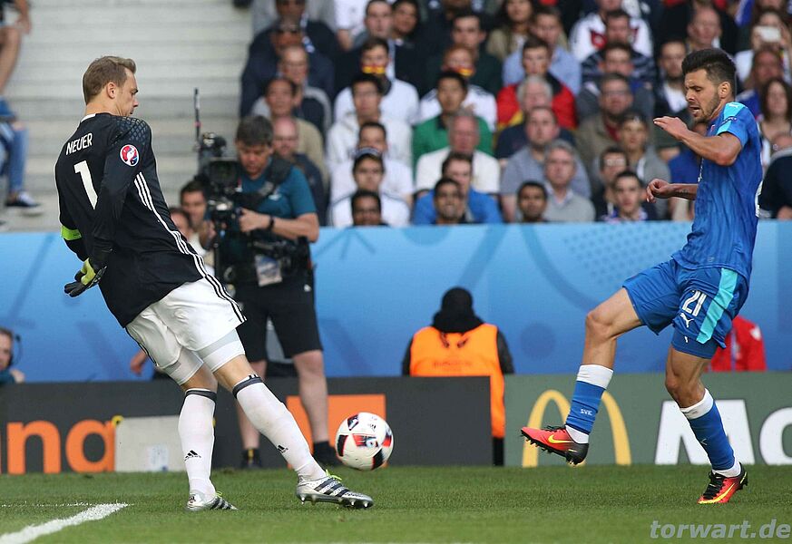 In der unteren Grafik wird deutlich, welcher Torhüter in welchem Spiel am meisten am Spielgeschehen beteiligt war. Lukasz Fabianski, der polnische Nationalkeeper, war im Achtelfinale gegen die Schweiz ganze 66 Mal am Ball, was im torwart.de-Ranking den ersten Platz einnimmt. Beim Sieg der Polen über die Eidgenossen aus der Schweiz (Schweiz - Polen 4:5 n.E.) war Fabianski ein Garant für den Erfolg. Mit starken Paraden sicherte er der polnischen Nationalmannschaft den ersten Viertelfinaleinzug, bei einer Europameisterschaft, in ihrer Geschichte. Die 60er-Marke packte Hugo Lloris im Viertelfinal-Spiel gegen Irland ebenfalls. Mit Torwartparaden konnte sich der französische Keeper nicht beweisen, doch am Spielaufbau und an der Spielverlagerung war er aktiv beteiligt. (Frankreich - Irland 2:1). Die wenigsten Ballkontakte in ihren Spielen hatten Joe Hart und Danijel Subasic. Sowohl England als auch Kroatien schieden im Achtelfinale aus. Der deutsche Nationalkeeper und Ersatzkapitän Manuel Neuer hatte im Spiel gegen die Slowakei nur 31 Ballkontakte. Trotz der geringen Anzahl war Neuer ein Garant für den wichtigen 3:0-Sieg über die Slowakei. In einer Drangphase der Slowaken parierte Neuer einen Ball hervorragend, was den 2:0-Führungstreffer im direkten Gegenzug ermöglichte.