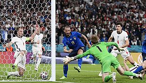 Auch Englands Pickford wurde im Finale nur selten geprüft. Eine starke Szene hatte er in der zweiten Halbzeit beim verdeckten Flachschuss von Chiesa. Pickford kommt rechtzeitig ins Gleichgewicht und lenkte den Schuss auf seine linke Ecke technisch hervorragend ins Toraus.