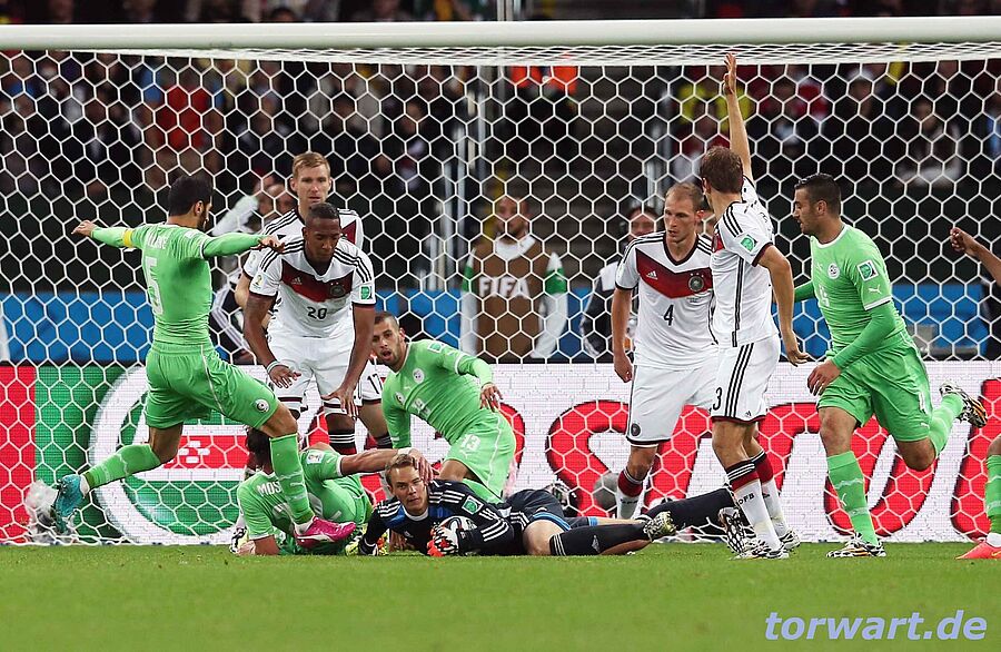 Dass das Spiel so brenzlig werden würde, hätten sich die wenigsten vor dem Spiel ausgemalt. Neuer warnte zwar, doch wurde seine Aussage eher als übliche Floskel abgetan: "Man kennt ja die nordafrikanischen Mannschaften. Sie sind sehr agil, sie rennen rauf und runter, sind auch vom Einsatz her da. Am Ball können sie eigentlich alles." Schon in der 11. Minute zeigte sich, wofür Neuer eigentlich da war. Slimani stürmte heran und wurde von Neuer an der Außenbahn verfolgt und abgegrätscht in klassischer Libero-Manier. Der Keeper ging dabei von Anfang an ein großes Risiko ein, auch eine mögliche Rote Karte zu kassieren. In der 18. Minute wäre Neuer jedoch geschlagen gewesen: Slimani köpfte den Ball nach einer Flanke von links an Neuer vorbei ins Tor, doch die Aktion war abseits und der Treffer zählte nicht. In der 28. Minute musste Neuer noch einmal wie ein Libero grätschen und ein Fehler Boatengs wettmachen. In der 51. Minute zeigte Neuer dann, wie wichtig er für das Offensivspiel ist, als er nach einem Eckball einen klasse Abschlag auf Schürrle spielte, der zum Konter führte. Dann aber musste Neuer in der 72. Minute wieder gewohnt zu seiner Libero-Rolle wechseln und einen gefährlichen Konter der Nordafrikaner in klassischer Kopfballmanier klären. In der 101. Minute hatte Neuer und Deutschland Glück, dass nach einem Khedira-Bock der Schuss eines Algeriers neben das Tor ging. In der 121. Minute war die Abwehr dann wohl ganz im Ruhestand und kassierte noch ein unnötiges 1:2, wobei Neuer wenig machen konnte als Djabou den Ball aus kurzer Distanz einschoss. Neuer war bei diesem Schuss machtlos, jedoch war wohl das gesamte Team schon beim Schlusspfiff. Am Ende hatte dann auch Manuel Neuer Befürchtungen, dass dieser Kampf noch viel Kraft gekostet hatte: "Es ist ein bisschen ärgerlich, wenn man sieht, dass Frankreich 2:0 gewonnen hat, in regulärer Zeit, und wir über 120 Minuten gehen mussten."