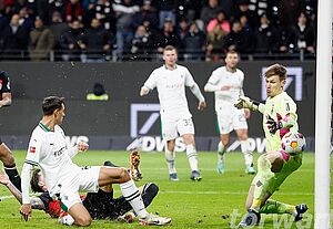 Die bis dahin beste Chance der Eintracht hatte Chaibi nach 55 Minuten mit einem Abschluss von halblinks flach auf die lange Ecke, doch Nicolas war schnell unten und konnte stark abwehren. In der zweiten Minute der Nachspielzeit traf Buta dann noch zum Ausgleich für die Hessen. Nkounkou flankte von Links auf den zweiten Pfosten, wo Buta komplett frei zum Kopfball kam und aus 7 Metern in die lange Ecke köpfte. Doch das war noch nicht der Schlusspunkte. Plötzlich drückte die Eintracht und erzielte in der siebten Minute der Nachspielzeit noch das 2:1. Nkounkou spielte von links scharf in die Mitte, wo Ngankam am ersten Pfosten verpasste, dahinter aber Koch in den Ball grätschte. im Zusammenspiel mit einem Gladbacher drückte der Frankfurter noch die Kugel über die Linie. Nicolas konnte aufgrund der kurzen Reaktionszeit nicht mehr eingreifen.