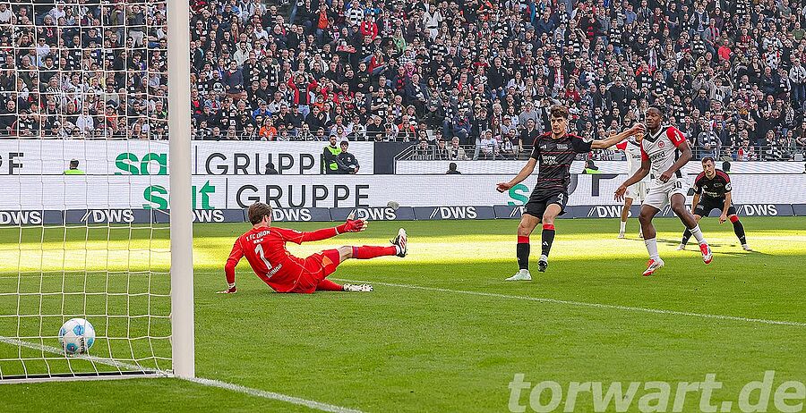 Union Berlin dreht das Spiel in Frankfurt dank eines starken Fredrik Rönnow. Mit dem ersten Abschluss im Spiel gingen die Hausherren allerdings in der 13. Minute durch Batshuayi in Führung. Uzun kam 18 Meter vor dem Tor an den Ball, verpasste aber den Abschluss, sodass Kristensen abzog, dessen Schuss aber von einem Berliner zu Batshuayiabgeblockt wurde, der somit aus halbrechten 12 Metern in die lange Ecke traf. Rönnow kam noch entgegen und bewegte sich dann spekulativ in die kurze Ecke. Der Treffer war somit nicht mehr zu verhindern.