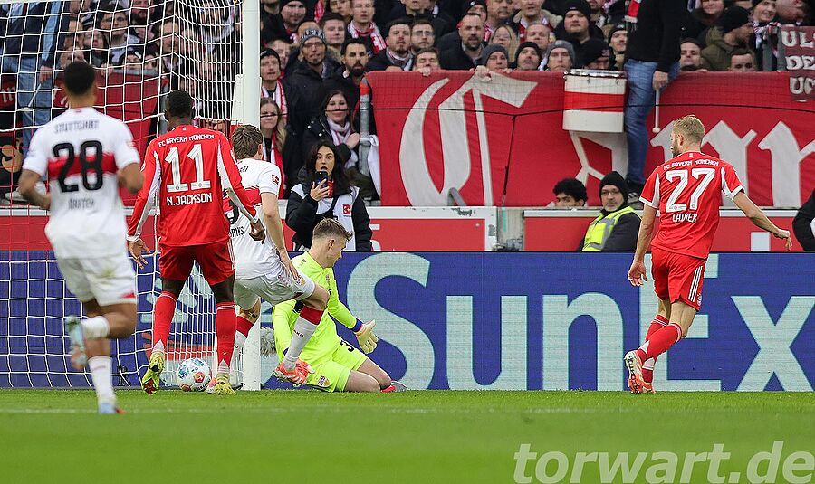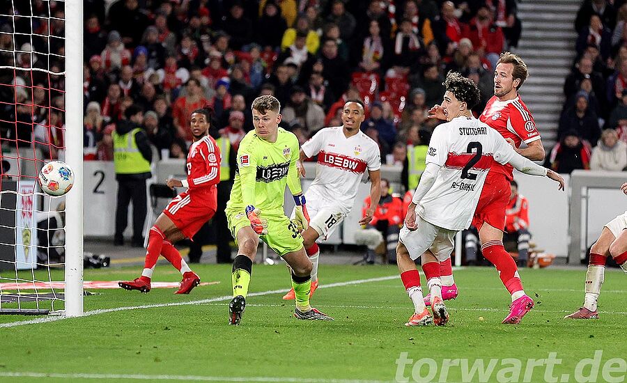 Nach etwas mehr als einer halben Stunde hatte der Stuttgarter Keeper Glück, als er einen flachen Schuss aus halbrechter Position auf die lange Ecke unter dem Körper hindurch rutschen ließ, die Kugel aber knapp neben dem Pfosten ins Toraus trudelte. Auch nach der Pause ergaben sich für die Bayern weitere Schüsse, die Nübel aber wiederum parieren konnte. Zu Beginn der Schlussphase traf Kane zum vorentscheidenden 0:2. Dieser kam aus zentralen 20 Metern zum Schuss und setzte diesen wuchtig flach in die lange Ecke. Nübel stand beim Schuss rund fünf Meter vor dem Tor, was letztlich für den Schuss zu hoch war. Ein Fehler lag aber nicht vor, da der Torschütze auch noch einen Pass in den Strafraum hätte spielen können. An den Schuss kam er auch mit einem guten Abdruck nicht mehr heran.