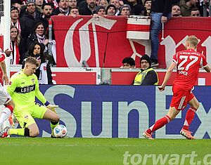 Alex Nübel bereits früh überwunden durch einen Tunnel von Konrad Laimer (foto: firo)
