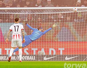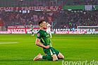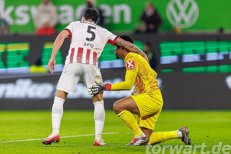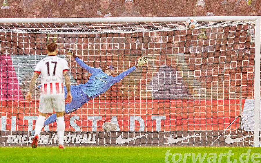 Ganz früh in der Partie sorgte Treu mit einem Volley-Schuss aus zentralen 14 Metern für die Führung für die Gäste aus dem Breisgau. Der Schuss schlug hierbei hoch in der rechten Ecke ein. Grabara stand breit und versuchte mit einem Abdruck aus dem Stand noch an den Ball zu kommen, wobei er mit der ballnahen Hand zum Schuss agierte. Selbst mit einem Übergreifen und einem weiteren Zwischenschritt wäre Grabara aber wohl absolut chancenlos gewesen.