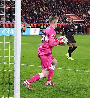 Alex Nübel verhinderte über 1 xG und hielt die Werkself auf weitem Abstand (foto: firo)