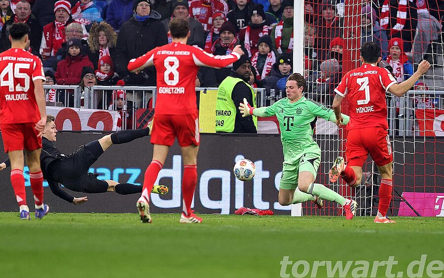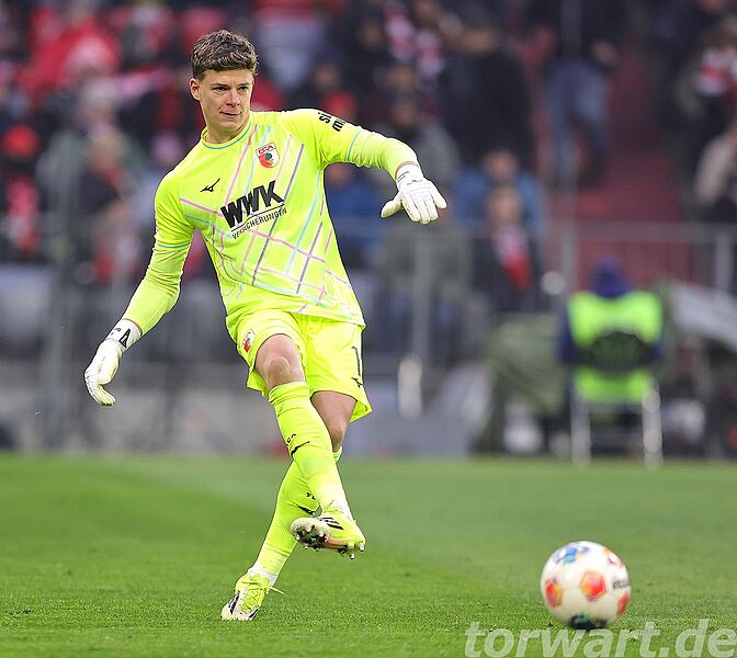 Gegen den FC Augsburg durfte auch aus Gründen der Belastungssteuerung Jonas Urbig spielen. Wirklich gefordert war der Münchner Torhüter dabei im ersten Durchgang bis kurz vor dem Halbzeitpfiff nicht. Dann aber setzte Fellhauer seinen Schuss aus halbrechter Position an die Latte in Richtung der langen Ecke. Urbig riss noch den Arm nach oben, wäre aber machtlos gewesen.