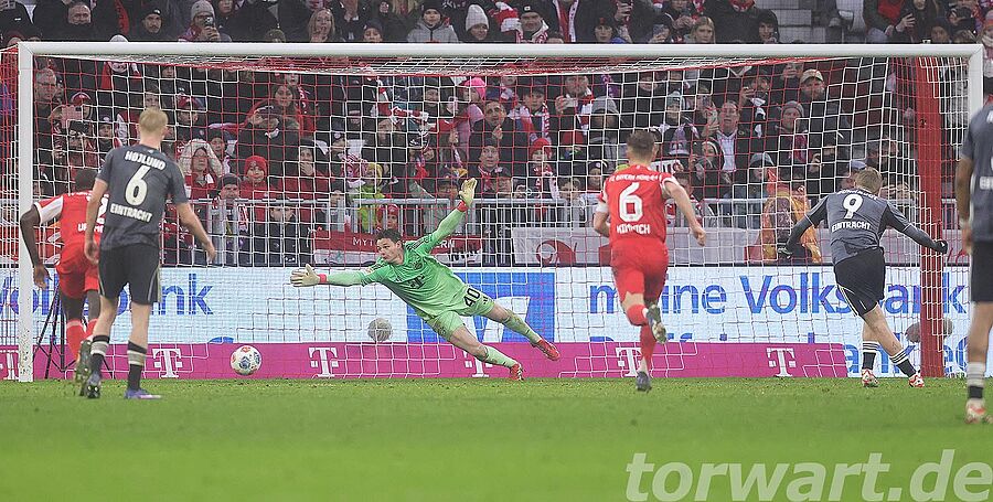 In der 86. Minute kam Frankfurt auf 3:2 heran. Urbig bekam im Spielaufbau den Ball und ließ sich zu einem riskanten Pass zu Kimmich hinreißen, wobei dieser die Situation eigentlich wieder beruhigen konnte. Letztlich verpasste Kimmich aber den erneuten Pass zu Urbig, der sich am ersten Pfosten anbot, und spielte blind in die Mitte, wo Kim auch nicht wirklich zum Ball ging und letztlich Kalimuendo anschoss, der dadurch zum Anschlusstreffer traf.