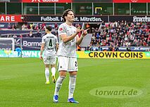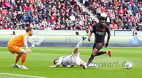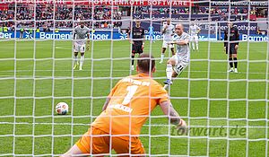 Direkt nach dem Ausgleich brachte Maehle die Gäste wieder in Führung. Bayer bekam einen langen Ball nicht geklärt, sodass Maehle einen Abpraller aus links versetzten 17 Metern halbhoch in die rechte Ecke jagte. Flekken stand hierbei gut, wobei sein Körperschwerpunkt etwas hinter den Füßen lag, wodurch auch sein Abdruck nicht ganz optimal war. Ein klarer Fehler lag dabei aber nicht vor, denn der Abschluss als solcher war ein wahres Geschoss. In der 38. Minute bekamen nun die Gäste einen Elfmeter zugesprochen. Diesen schoss Eriksen flach in die rechte Ecke. Flekken war in die andere Richtung unterwegs und somit chancenlos.