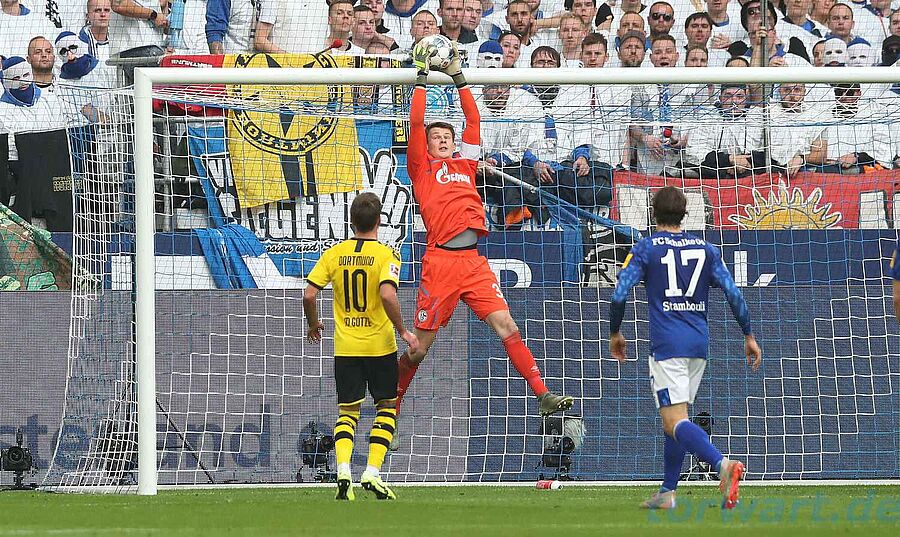 Alexander Nübel / FC Schalke 04: Zwar hatte der BVB durch einen Fernschuss von Sancho - Nübel parierte - bereits nach drei Minuten eine dicke Möglichkeit, doch mehr Aktionen vor den Toren gab es lange Zeit nicht. Nübel war mit einem guten Positionsspiel zur Stelle. Im weiteren Verlauf der ersten Halbzeit kam von den Gästen kaum etwas. Nübel musste nur selten entscheidend eingreifen. Nach Wiederanpfiff blieb das Bild unverändert: Schalke bestimmte weiter das Spielgeschehen, Dortmund agierte fahrig, ohne Zug zum Tor. Wie schon im ersten Durchgang hatte der BVB seine besten Aktionen über Sancho. Nach Doppelpass mit Götze schlenzte der junge Engländer knapp am Kasten vorbei. Erst in der letzten Viertelstunde der Partie taute der BVB auf. Dortmund kam mehr und mehr zu gelungenen Angriffen, ohne sich viele Torchancen zu erarbeiten. Die beste Möglichkeit vergab wieder Sancho nach Reus-Pass - erneut parierte Nübel. Danach passierte nicht mehr viel, sodass es beim 0:0 blieb. Der Kapitän hielt die Null fest.