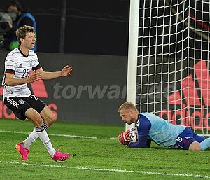 Es waren 3 Minuten im zweiten Durchgang gespielt, als die deutsche Nationalmannschaft durch Neuhaus in Führung ging. Eine Flanke landete auf Umwegen bei Neuhaus, der aus 6 Metern Schmeichel überwand. Schmeichel sprang hierbei in seine rechte Ecke, agierte dabei aber rein spekulativ und war dementsprechend machtlos, da Neuhaus den Ball in die Mitte drosch. Demnach wäre es besser gewesen, aus dieser Entfernung einfach die Trefferfläche zu maximieren. Wirklich gezielte Abwehraktionen sind aus dieser kurzen Distanz wie bei dem Schuss von Neuhaus nicht wirklich möglich.