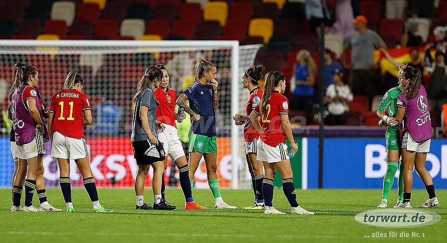 Mit dem Titel für die Spanierinnen wird es hingegen schwer. Das zeigte auch das Spiel gegen die deutsche Mannschaft. Zwar verfüget Spanien über eine sehr hohe fußballerische und technische Klasse, doch dies allein nicht schützt nicht vor unkonzentrierten Aktionen. So leitete ausgerechnet die spanische Torhüterin, Sandra Panos, die deutsche Führung ein. In der dritten Minuten spielte die Schlussfrau ohne Bedrängnis einen Pass, welcher für die eigene Außenverteidigerin gedacht war, in die Füße von Bühl, die dadurch allein auf Panos zulaufen konnte und letztlich ohne große Mühe einschieben konnte. Trotz des Fehlpasses spielte die spanische Hintermannschaft weiterhin auch die eigene Torhüterin an, die anschließend wiederum ihre hohen fußballerischen Fähigkeiten unter Beweis stellen konnte. So passt sie mit ihrem Spielstil in die spanische Auswahl. Auf der Linie wiederum war Panos gut gefordert und konnte sich daher kaum auszeichnen. Bei dem 0:2 durch Popp konnte die Keeperin nicht mehr ausreichend reagieren und musste daher den Gegentreffer hinnehmen. Mit einem explosiven Abdruck vorhanden gewesen, den Ball noch zu erreichen. Im weiteren Verlauf konnte sich Panos in der Torverteidigung nicht mehr auszeichnen und fiel dadurch im großen Bereich durch ihren Fehlpass zum 0:1 auf. Allerdings haben die Spanierinnen nach wie vor die Möglichkeit, das Viertelfinale zu erreichen.