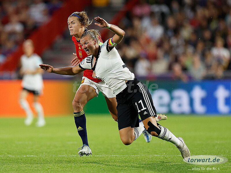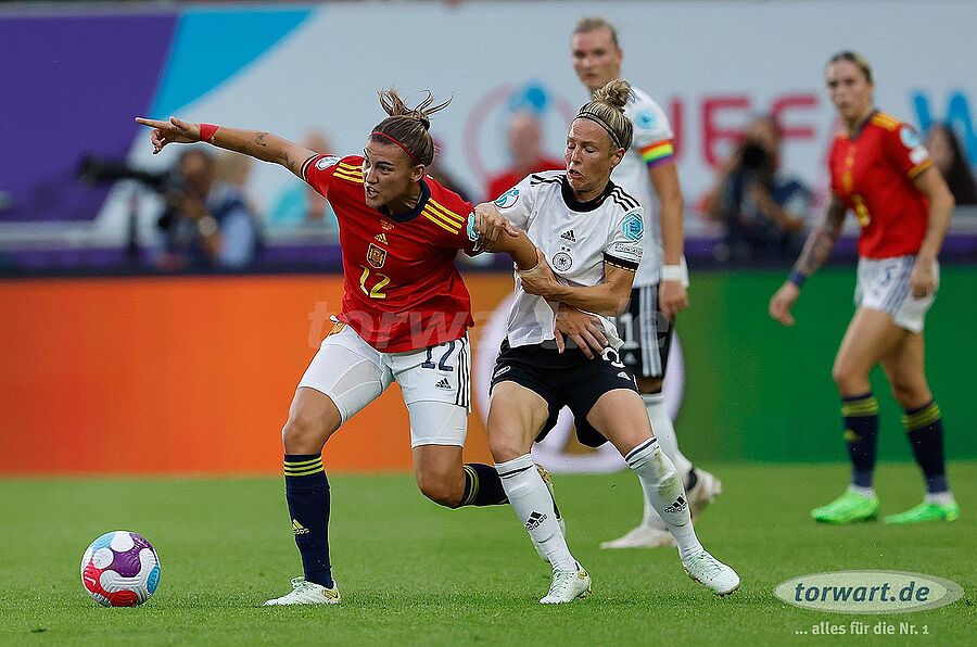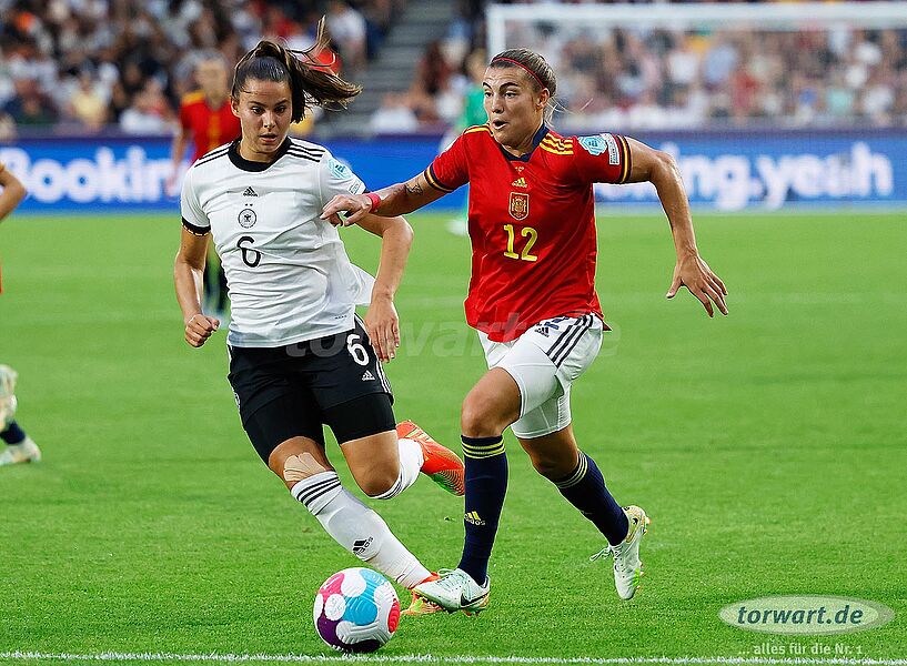 Die DFB-Frauen haben vorzeitig das Viertelfinale der Europameisterschaft erreicht und stehen gleichzeitig vor dem letzten Gruppenspiel gegen Finnland bereits als Gruppensieger fest. Grund dafür ist der 2:0 Sieg gegen Mitfavorit Spanien, was trotz des Ausfalls von Weltfußballerin Alexia Putellas über Weltklasse-Spielerinnen verfügte. Von Beginn an war das typische spanische Kurzpass-Spiel zu beobachten. Von Beginn an hatte Spanien die größeren Spielanteile und mehr Ballbesitz, doch stand die deutsche Abwehr zumeist sehr sicher. Natürlich spielte der DFB-Auswahl auch die eigene frühe Führung in die Karten, die sich fortan weiter auf die eigene Abwehr konzentrieren konnte. Gleichsam schafften es die Spanierinnen immer wieder, zu eigenen Möglichkeiten zu kommen. Bei einem tollen Pass in den Lauf auf Lucia Garcia, die allein auf das deutsche Tor laufen konnte, kam Frohms übermütig aus dem Tor geeilt und zeigte in dieser Szene nicht das beste Timing. Für einen direkten Angriff auf den Ball kam sie den berühmten Schritt zu spät, für eine ruhigere Positionierung stand sie dann wiederum zu hoch. Allerdings musste Garcia die Torhüterin dadurch nur umkurven, kam etwas zu weit nach außen ab und traf letztlich nur das Außennetz- Glück für die deutsche Mannschaft.