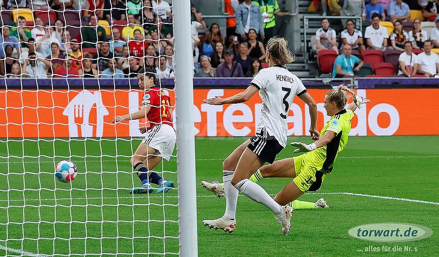 Auch im Anschluss gab es weitere Abschlüsse, doch war gleichzeitig die die große Stärke von Frohms zu erkennen. Auf der Linie ist die deutsche Nummer 1 eine absolut sichere Bank. Was sich schon im ersten Gruppenspiel gegen Dänemark zeigte, zeigte sich auch gegen Spanien. Bei Fernschüssen steht Frohms immer wieder gut und verfügt über eine hohe Explosivität und tolle Reflexe. Konnte die alte und nunmehr neue Wolfsburger Keeperin noch einige mehr oder minder gefährliche Chancen sicher vereiteln, hatte sie ihre mit Abstand beste Szene in der 71. Minute. Mit einem feinen Spielzug konnte Caldentey bedient werden die volley aus 10 Metern auf die lange Ecke abschloss, doch die Torhüterin konnte mit einer fantastischen Parade den Ball noch um das Tor lenken.