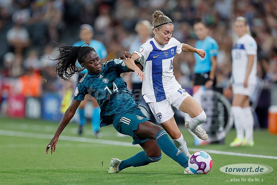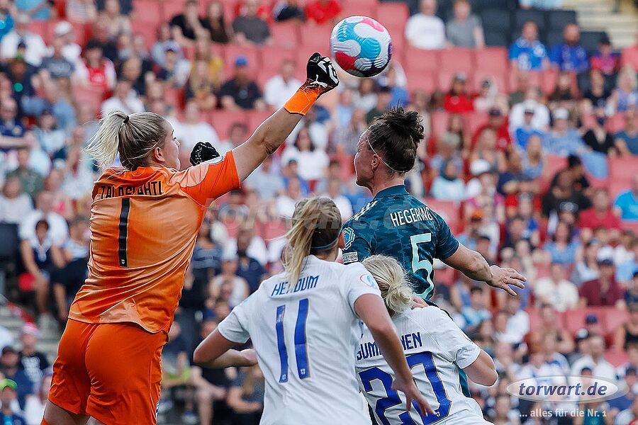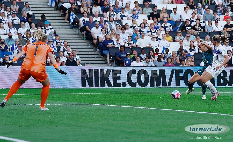 Auch im dritten Spiel in der Gruppenphase der Europameisterschaft bleiben die DFB-Frauen ohne Gegentor und gewinnen verdient gegen Finnland mit 3:0. Dabei ging das Spiel von Beginn an in eine Richtung. Finnland war nahezu ausschließlich in der Defensive gefordert. Vor allem über Flanken wurde es für die Finninnen mehrfach gefährlich. Die erst 21-jährige Katriina Talaslahti rückte dadurch mehrfach in den Fokus, indem sie mehrere Flanken jeweils mittels Faustabwehr klären konnte. Gleichzeitig merkte man der Torhüterin das junge Alter noch an. Sie wirkte mehrfach nervös und konnte einer sich unter Dauerdruck befindlichen Abwehr auch nur wenig Sicherheit verleihen.