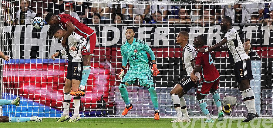 Gemessen an den Chancen waren die Kolumbianer in der ersten Hälfte sogar die bessere Mannschaft. Durch phasenweise hohes und aggressives Pressing konnten sich die Südamerikaner auch ab und an gute Chancen erspielen, wobei Ter Stegen in den ersten 45 Minuten auch nur zweimal wirklich eingreifen musste. So konnte er einen Kopfball von Borré auf der Linie mit einer guten Flugeinlage sicher abfangen. Nach einer halben Stunde zog aus der zweiten Reihe etwas links versetzt auf die lange Ecke ab, doch Ter Stegen agierte herausragend und konnte den wuchtigen Schuss mittels Übergreifen gerade noch über das Kreuzeck lenken. Wenig später musste Thiaw in höchster Not noch retten, als Borré auf das Tor zulief. Mehr passierte bis zur Pause dann nicht mehr.