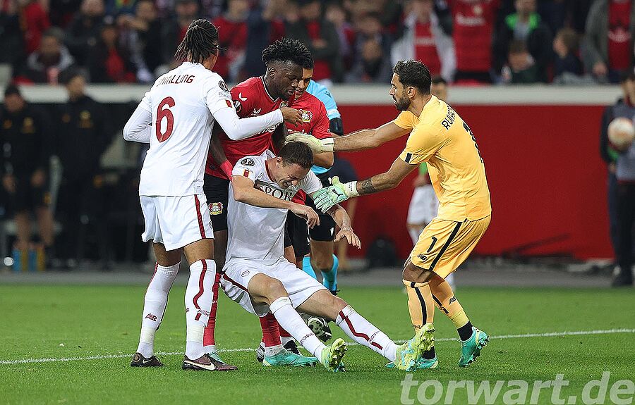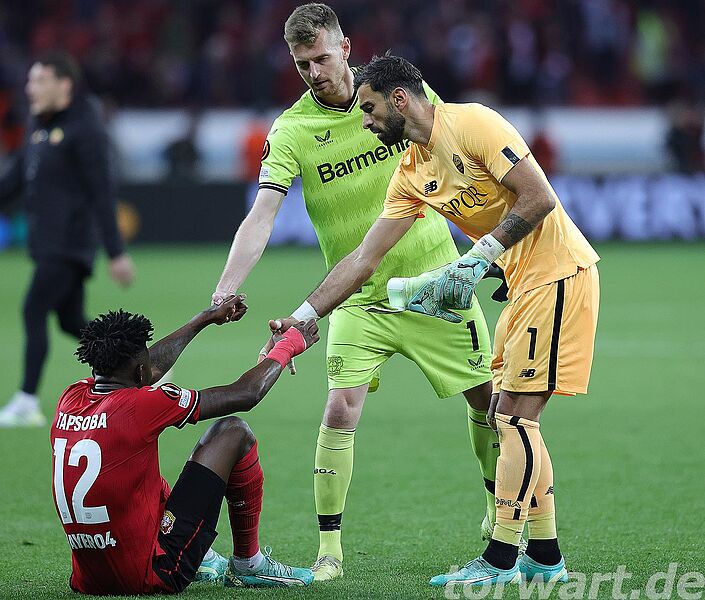 Enttäuschte Gesichter bei Hradecky und Leverkusen, nachdem sie keinen Weg an Roms Verteidigung gefunden haben (foto: firo)
