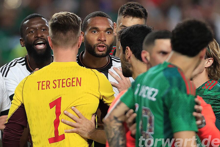 Für den deutschen Torhüter begann das Spiel mit einer Unachtsamkeit, als er einen schwachen Ball in die Füße des Gegners spielte, der anschließende Schuss von Alvarez von ihm aber pariert werden konnte. Im weiteren Verlauf stabilisierte sich die deutsche Abwehr nach stürmischen Beginn der Mexikaner. Diese kamen dann ab Mitte der ersten Hälfte mit mehreren Bällen in die Spitze zu guten Szenen, doch musste Ter Stegen hierbei jeweils nicht eingreifen. In der 36. Minute erzielte Antuna den Ausgleich. Lozano setzte sich auf links stark durch und spielte dann scharf auf den ersten Pfosten, wo der Torschütze einlief und mit dem Fuß vor Rüdiger links einschoss. Ter Stegen stand zwar im bedrohten Eck, nachdem er die Hereingabe nicht hätte angreifen können, bewegte sich dann aber spekulativ in die anderen Richtung, sodass er nicht mehr abwehren konnte, obwohl er den Ball noch mit der Hüfte touchierte.
