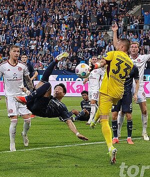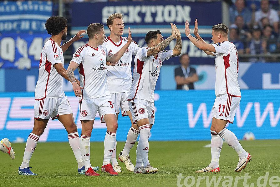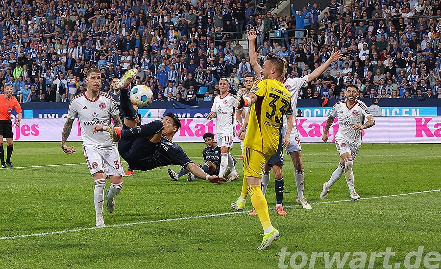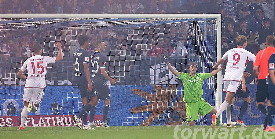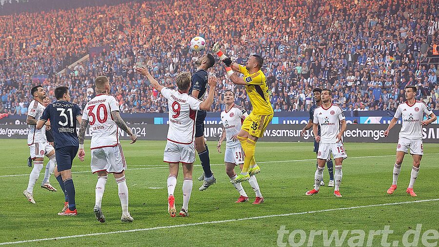 Der VfL Bochum verliert zu Hause mit 0:3 und benötigt nun in Düsseldorf eine ganz andere Leistung, um den drohenden Abstieg doch noch abzuwenden. Zu Beginn der Partie benötigten die Gäste einige Minuten, um im Spiel anzukommen. Ein erster Versuch aus der Distanz landete direkt in den Armen von Luthe, der nach der Streichung von Manuel Riemann das Tor hütete. Durch viel Glück ging Düsseldorf in der 13. Minute in Führung. Tzolis schlug einen Eckball direkt scharf auf das Tor, sodass der in der Mitte postierte Luther in die bedrohte kurze Ecke sprang, die Kugel aber an den ersten Pfosten prallte und von dort zum Bochumer Hofmann sprang. Dieser konnte den Oberschenkel nicht mehr wegziehen und drückte mit diesem Körperteil den Ball ins eigene Tor, während Luthe noch am Boden lag.