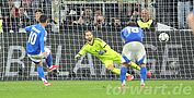Kurz nach der Pause brachte Kean die Gäste nochmal ein Stück weit zurück in die Partie. Dieser zog aus 17 Metern zentraler Position ab und traf wuchtig in die linke untere Ecke. Baumann stand rund 4 Meter vor dem Tor und damit ziemlich hoch, sodass ihm letztlich auch die Zeit fehlte, ausreichend zu reagieren. Allerdings wäre der Schuss auch mit tieferer Position nur äußerst schwer zu parieren gewesen. Kean traf in der 69. Minute zum 3:2 aus halblinken 10 Metern hoch in die lange Ecke. Baumann stand zum Zeitpunkt des Schusses ziemlich breit und konnte somit keinen Abdruck generieren und ließ sich viel mehr nur nicht in die Richtung des Schusses hineinfallen. Parieren konnte er so allerdings nicht mehr.