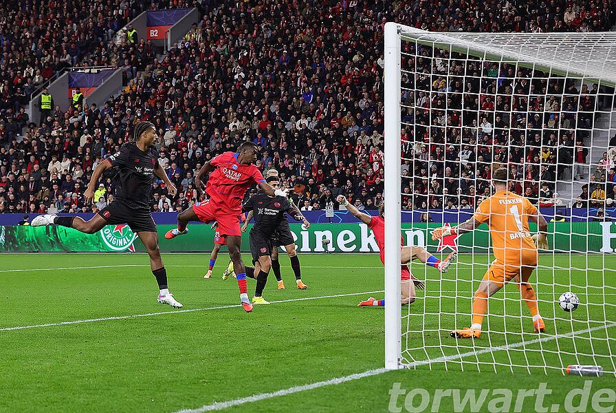 Früh in der Partie gingen die Gäste in Führung. Nachdem ein Eckstoß von rechts zunächst kurz ausgeführt wurde, schlug Mendes eine Flanke auf den zweiten Pfosten, wo Pacho einlief und aus 6 Metern per Kopf in die linke Ecke traf. Flekken konnte dabei die durchaus scharfe Hereingabe nicht angreifen und blieb richtigerweise auf der Linie, musste daher aber auch lange warten, ob jemand in der Mitte an den Ball kommt, sodass er beim Treffer selbst noch in der Mitte stand und nur noch hinterherschauen konnte.