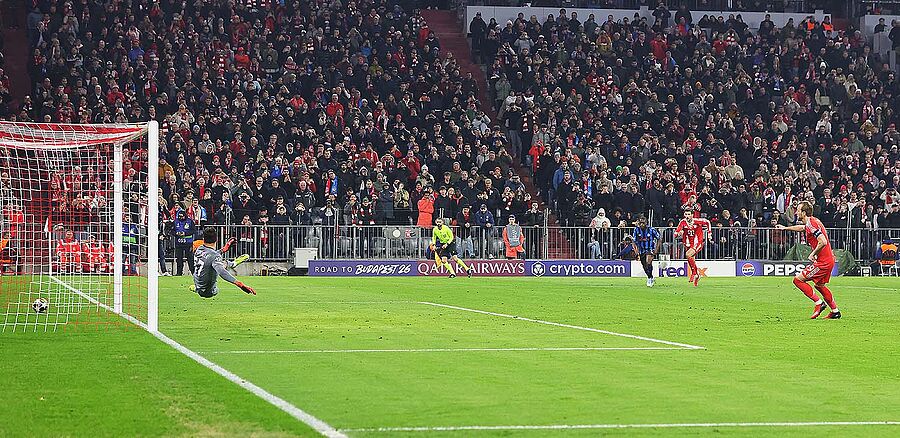 Von Beginn an waren die Bayern wieder das stärkere Team und hatten früh im Spiel die ersten guten Abschlüsse. Diese wurden aber jeweils von Marco Sportiello pariert, der auch aufgrund der klaren Ausgangslage für Carnesecchi zum Einsatz kam. In der 25. Minute bekamen die Gastgeber einen Handelfmeter zugesprochen. Kane zielte auf die rechte Ecke und scheiterte am Keeper, der die Ecke ahnte. Allerdings bewegte sich Sportiello zu früh von der Linie, sodass der Elfmeter wiederholt wurde. Erneut visierte Kane die rechte Ecke an und war nunmehr erfolgreich, während der Keeper in die andere Ecke unterwegs war.