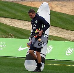 Pascal Formann mit einem torwart.de-Trainingsdummy und einem torwart.de Reaction Shield ((c) vfl-Wolfsburg)