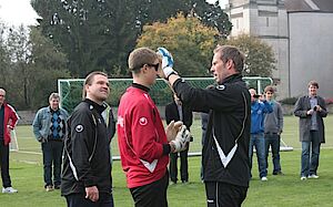 Im Anschluss an die theoretischen Ausführungen ging Schlieck mit drei Torhütern der Vorarlberger Fußballakademie und der Teilnehmergruppe auf den Platz und demonstrierte anhand von verschiedenen Übungsbeispielen wie Life Kinetik in der Torwarttrainingspraxis funktioniert.