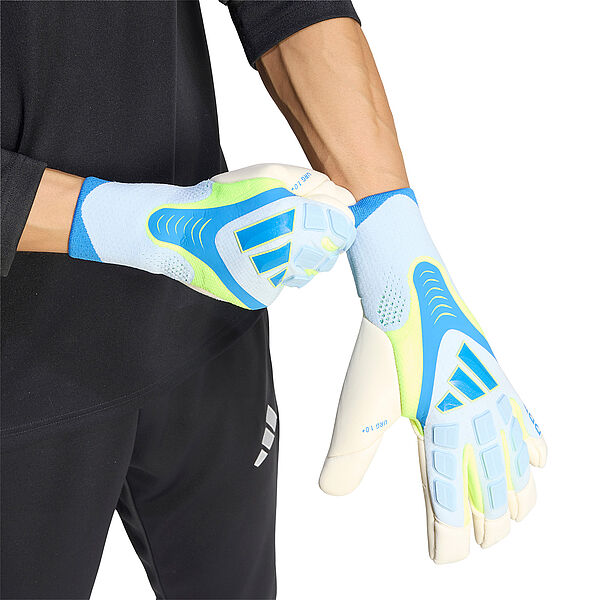 Die zweite Hauptkollektion für das Jahr 2026 präsentiert die Predator Torwarthandschuhe in hellem Eisblau mit leuchtenden grünen Akzenten, die eiskalte Dominanz und mentale Stärke verkörpern. Diese Farbkombination vereint genau die Eigenschaften, die einen starken Torhüter auszeichnen: volle Kontrolle und einen klaren Kopf – selbst in den hitzigsten Spielmomenten.