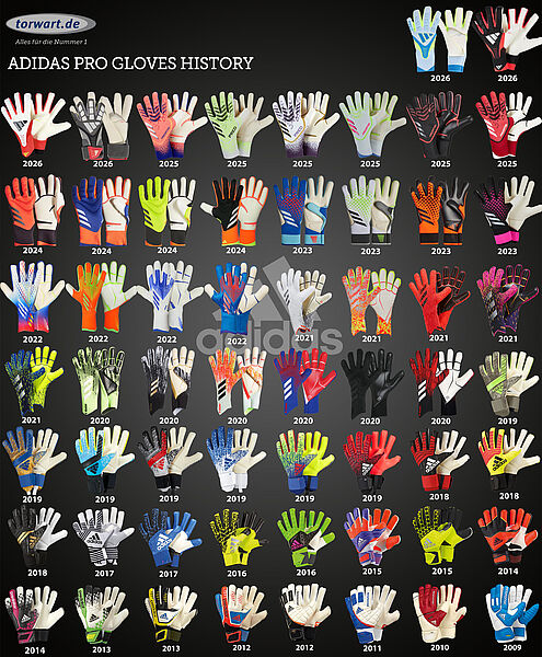 Hier haben wir eine Übersicht aller adidas Pro Torwarthandschuhe seit 2009 erstellt. Die Entwicklung geht vom adidas Response Pro 2009 bis zum heutigen Predator Pro mit der gestrickten Rückhand.