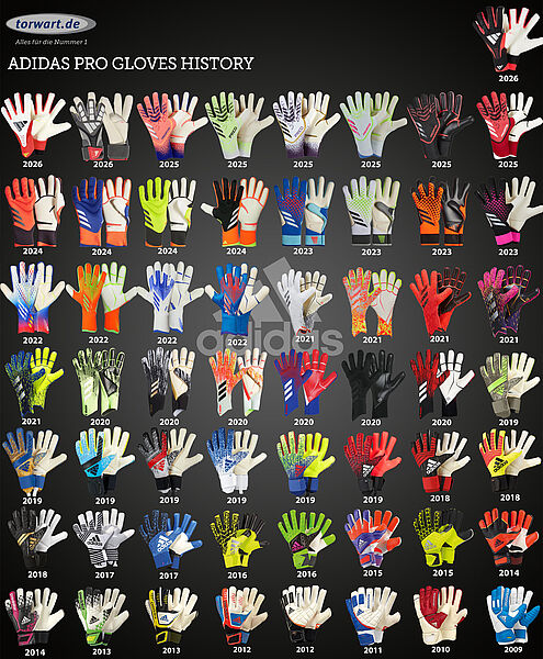 Hier haben wir eine Übersicht aller adidas Pro Torwarthandschuhe seit 2009 erstellt. Die Entwicklung geht vom adidas Response Pro 2009 bis zum heutigen Predator Pro mit der gestrickten Rückhand.