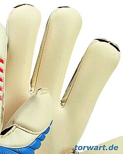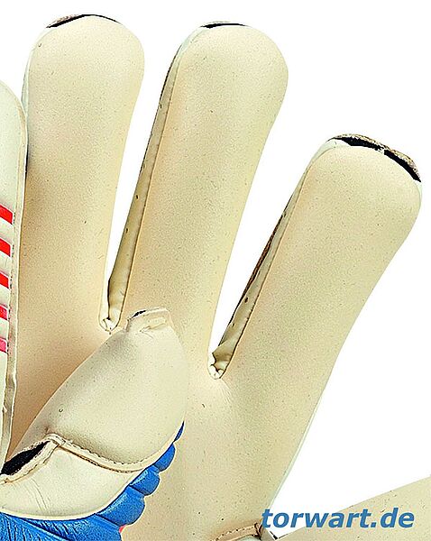 Der adidas Predator Pro 2012 verfügt über den Innennaht-Schnitt, der für einen sehr engen Sitz an den Fingern und ein besonders gutes Ballgefühl sorgt. Eigentlich wäre dies gar nicht der Rede wert, denn mittlerweile zeichnen sich viele Topmodelle der verschiedenen Hersteller dadurch aus. Doch adidas wäre nicht adidas, wenn das Gewöhnliche ausreichen würde. So entwickelte man in Herzogenaurach eine ganz spezielle Schnittform für die Innenhand. Diese zeichnet sich dadurch aus, dass die Finger ein wenig breiter geschnitten und die Schichtel vergleichsweise schmal sind. Dadurch rollt sich der Haftschaum leicht um die Finger und eine außergewöhnliche Passform entsteht. Das Tragegefühl ist sehr gut und erinnert ein wenig an das einen zur Oberhand hin innengenähten Rollfinger-Schnitt. Obendrein sind die Finger des adidas Predator Pro 2012 leicht vorgeformt und orientieren sich somit an der natürlichen Handhaltung. Die Nähte zwischen der Innenhand und den Schichteln sind nicht zu spüren, sodass die von adidas gewählte Bezeichnung "Seamless Touch" absolut passend ist. Apropos Schichtel: Diese bestehen bei adidas Predator Pro 2012 aus Haftschaum - so wie es sich viele gewünscht haben. Dadurch ergibt sich ein besonders enger Sitz. Viel wichtiger ist jedoch, dass so stets garantiert ist, dass der Ball mit Haftschaum in Berührung ist. Vor allem im Falle sich verdrehender Finger ist dies besonders wichtig. Es muss allerdings erwähnt werden, dass sich die Finger im Praxistest - auch durch die besondere Schnittform - in keiner Situation verdreht haben und diese Befürchtung eigentlich unbegründet ist. Auch die Schichtel an den Außenseiten des Zeigefingers und des kleinen Fingers bestehen aus Haftschaum, sodass der gesamte adidas Predator Pro 2012 ohne Mesh-Material auskommt. Der Daumen ist von beiden Seiten vom Haftschaum der Innenhand überzogen, wodurch der Name "Double Thumb Wrap" zustande kommt. An der Fingerspitze ist der Haftschaum übergeklappt und im unteren Bereich des Daumens wird der Haftschaum bis auf die Oberhand gezogen. Dies wirkt sich sehr positiv auf den Tragekomfort aus, da die Nähte an diesen Stellen wegfallen. Zusätzlich wird durch den Haftschaum die Stabilität des Daumens erhöht.