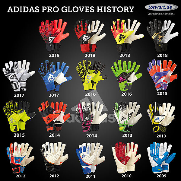 Hier haben wir eine Übersicht aller adidas Pro Torwarthandschuhe seit 2009 erstellt. Die Entwicklung geht vom adidas Response Pro 2009 bis zum heutigen Predator Pro mit der gestrickten Rückhand.