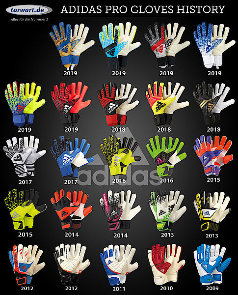 Hier haben wir eine Übersicht aller adidas Pro Torwarthandschuhe seit 2009 erstellt. Die Entwicklung geht vom adidas Response Pro 2009 bis zum heutigen Predator Pro mit der gestrickten Rückhand.