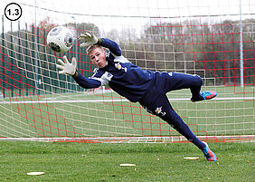 Nach dem Abdruck ist es enorm wichtig, dass ausreichend Körperspannung aufgebaut wird (Abb. 3). Der Torwart springt zudem in den Ball hinein. Das bedeutet: Er wartet nicht passiv auf den Ball, sondern seine Hände gehen diesem aktiv entgegen! Beim Sprungverhalten ist das genauso. Der Keeper liegt nach dem Absprung nicht waagerecht in der Luft, sondern springt schräg nach vorne - dem Ball entgegen! Als Orientierung helfen hier in Sprungrichtung aufgestellte Hütchenteller.