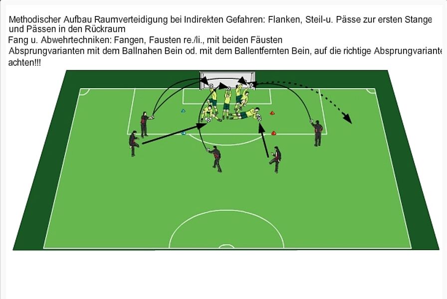 Trainingsaufbau bei Indirekten Gefahren: Flanken, Steilpasssituationen, Pässe zum Ersten Pfosten und Bälle in den Rückraum von der Torauslinie.