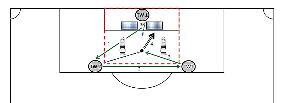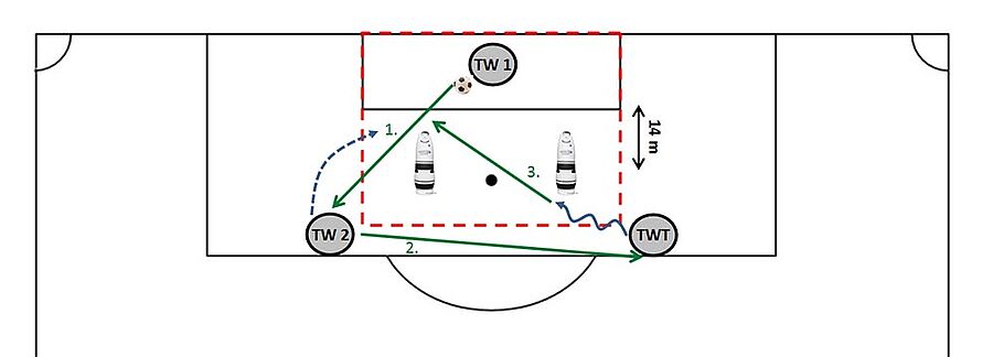 TW1 rollt den Ball auf TW2 der den Ball mit dem ersten Kontakt auf den Torwarttrainer weiterleitet. Dieser spielt den Ball diagonal flach in den Fuß von TW2 zurück der den Ball zentral vor dem Tor zwischen den Dummies annimmt. TW1 hat nach dem Pass des Trainers bereits die Position offensiv vor den Minitoren eingenommen, nun muss TW2 den Ball flach in eines der beiden Minitore schießen. Torwart1 agiert aus einer tiefen Grundstellung und wehrt den Ball mit einer Fußabwehr ab.