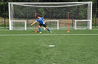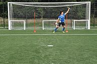 Variation: Nun stehen die Torhüter hinter dem Balancepad. Dabei gehen sie in leichte Tappings. Auf ein optisches und akustisches Signal springen die Torhüter einbeinig nach Vorne auf das Balancepad. Dort halten sie das Gleichgewicht und springen im Anschluss zurück in die Ausgangsposition.