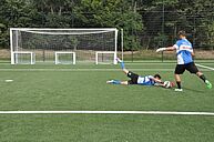 Variation: Torwart2 kann den Ball halbhoch auf das Minitor schießen- der handelnde Torwart1 muss den Ball nun mit der Hand abwehren.