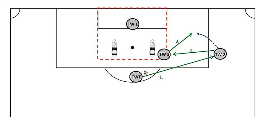 TW1 passt den Ball auf TW2 der den Ball mit zwei Pflichtkontakten auf den Torwarttrainer passt. Dieser spielt den Ball diagonal flach in den Fuß von TW2 der in Richtung des Dummies gestartet ist.TW2 darf den Ball erst nach dem zweiten Kontakt abschließen. Der TW1 im Tor hat nach dem Pass des Trainers einen Raumgewinn erzielt, in dem er nach vorne in Richtung des Schützen geschoben ist. TW1 hat die Position so ausgerichtet, dass er nun nicht mehr als 2m entfernt ist vom Schützen, sobald er diese Distanz erreicht hat agiert TW1 aus der Blockstellung.