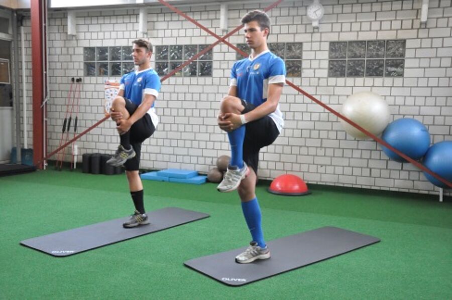 Aufbau: Torwart1 und Torwart2 stehen einbeinig auf je einem Balancepad.